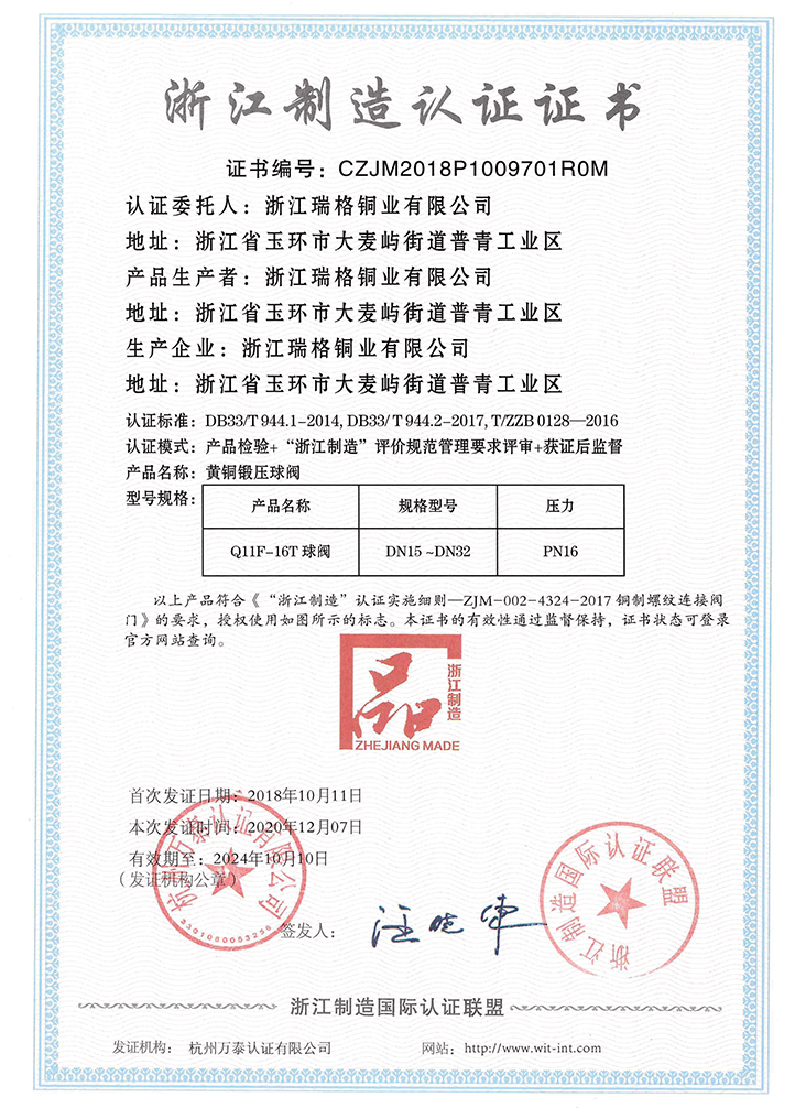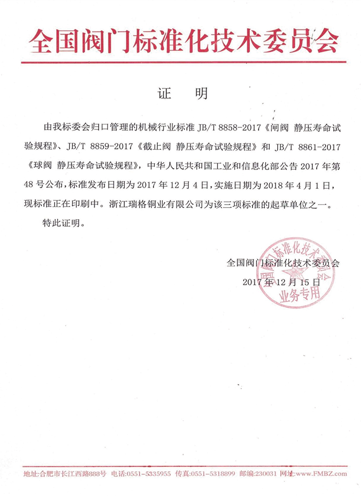 公司先后通過IS09001, IS014001, TS壓力管道許可證、標(biāo)準(zhǔn)化良好行為認(rèn)證、中國節(jié)水產(chǎn)品認(rèn)證、中國城市燃氣協(xié)會會員單位等各類體系認(rèn)證,榮獲“浙江省著名商標(biāo)”、“浙江名牌產(chǎn)品”、中國建筑五金行業(yè)“知名品牌”、中國質(zhì)量萬里行質(zhì)量信用企業(yè),“全國水暖、閥門名優(yōu)品牌定點生產(chǎn)(采購)企業(yè)”、”AAA”級信用企業(yè)、浙江省工商局”A級信用企業(yè)”、玉環(huán)縣百強企業(yè)和玉龍企業(yè)等諸多榮譽。2010年公司受邀參加由全國閥門標(biāo)準(zhǔn)化委員會組織、合肥通用機械研究院主持,經(jīng)中華人民共和國工業(yè)和信息化部核準(zhǔn)的閥門標(biāo)準(zhǔn)的起草和制定。公司產(chǎn)品由中國人保財險提供產(chǎn)品責(zé)任保險。